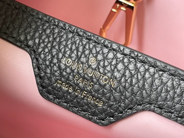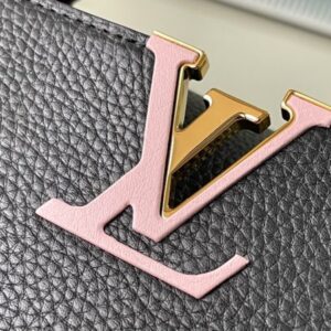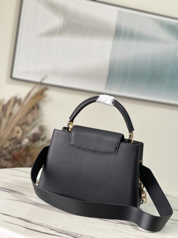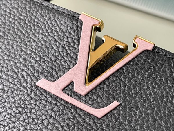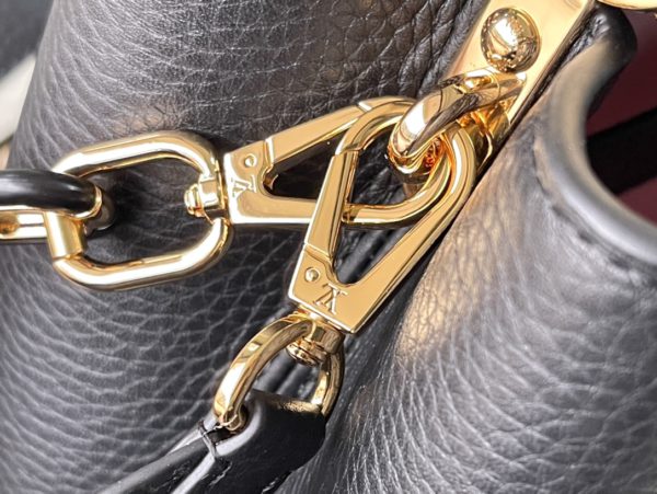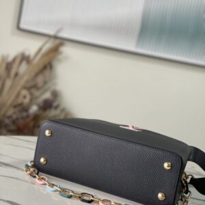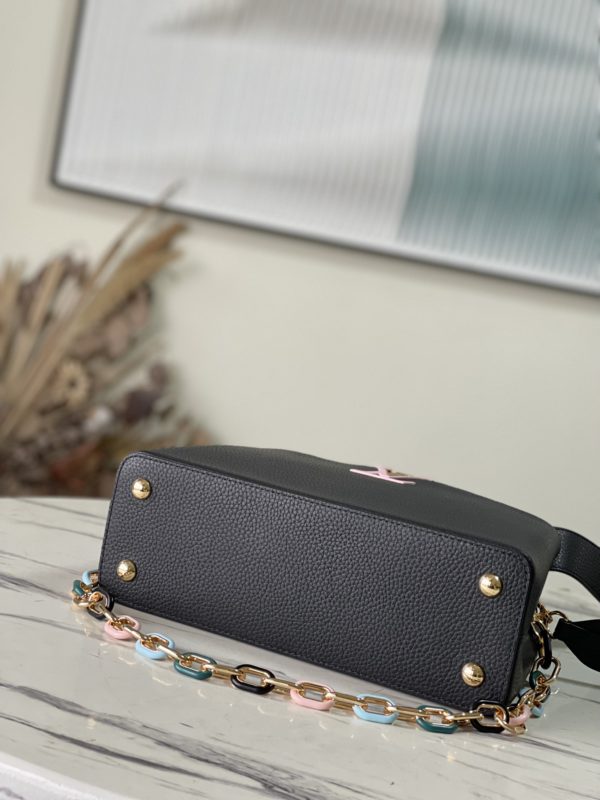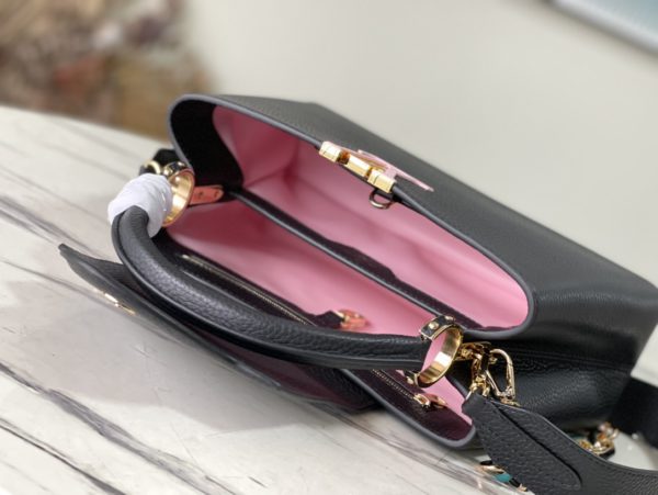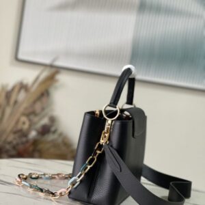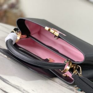 Black Medium This Capucines medium handbag is made of Taurillon leather, and the metal and resin links are interlocked with each other. The top handle and detachable wide shoulder strap add a fun carrying method. The signature flap of the Capucines collection is folded in to reveal the logo.