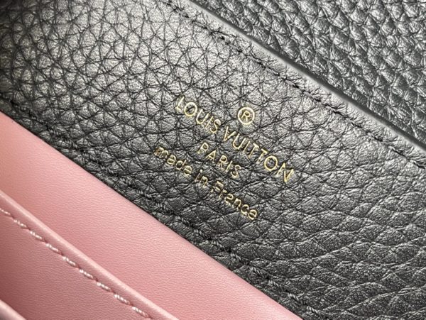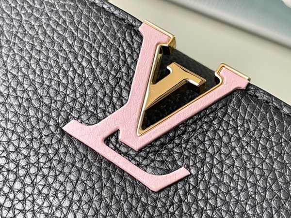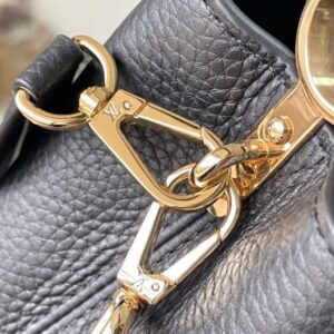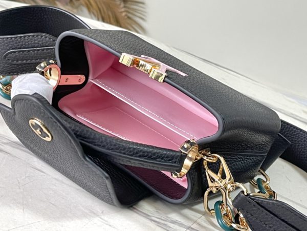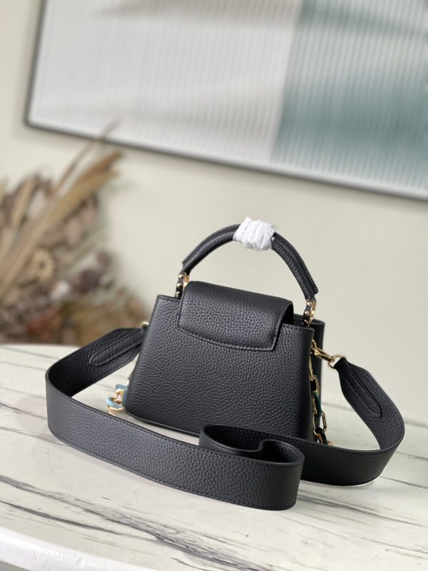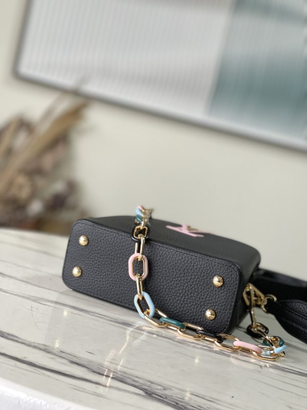 Black Mini This Capucines mini handbag has metal and resin links that interlock with each other, adding a twist to a classic design with a removable chain. Taurillon leather has a lustrous look, and the flap is placed on the inside to reveal the logo.