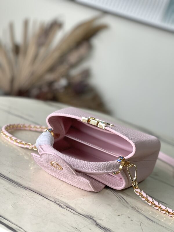 Pink small Capushine series launches this Capucines mini handbag. The luminous Taurilon leather presents a lustrous texture through the spray-painting process, admiring the warm sunshine above the first snow in winter and under the wine. Lettering and handle rests feature a chic gloss inspired by ski goggles.