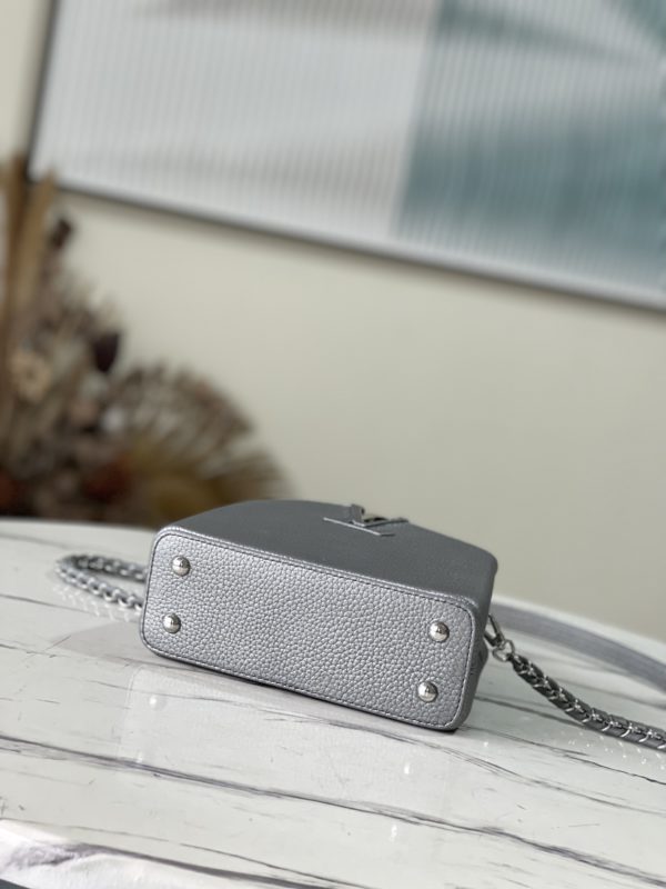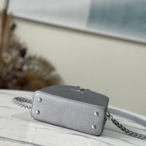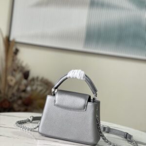 Silver gray mini This Capucines mini handbag shimmers with the subtle luster of Taurillon leather, which complements the shell-like appearance of the letters, with a woven leather chain. Gentle lines and traditional elements create a soft charm.