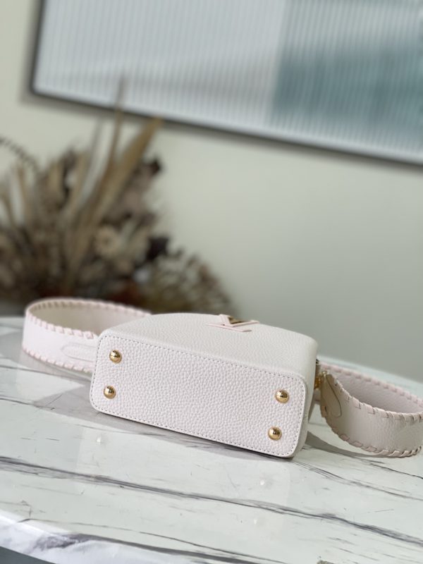 Creamy white with light pink webbing style This Capucines mini handbag focuses on exquisite craftsmanship Taurillon leather bag body and handle and shoulder strap color details reflect contrast Metal texture leather wrapped V letter Capucines series flap can be outside Set or retract.