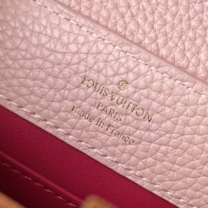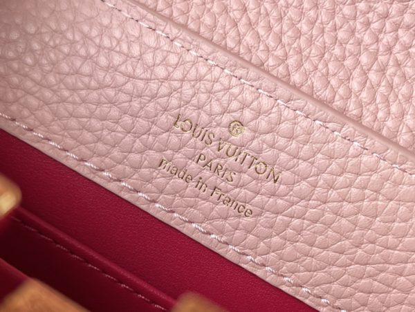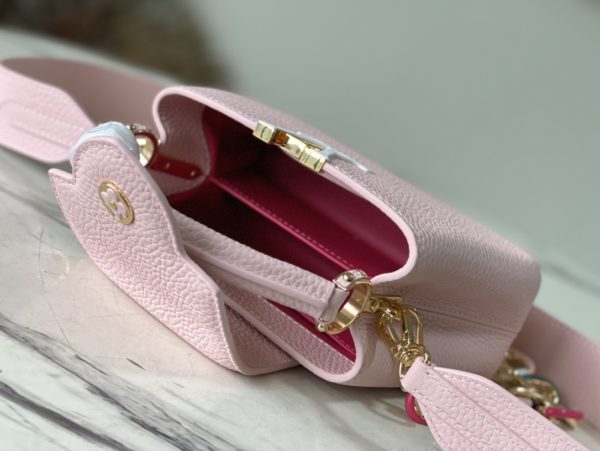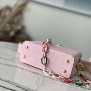 Pink Mini This Capucines mini handbag has metal and resin links interlocking for a playful twist on a classic design with a removable chain. Taurillon leather has a lustrous look, and the flap is placed on the inside to reveal the logo.