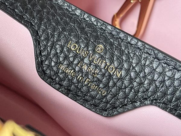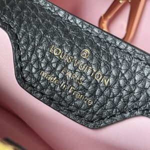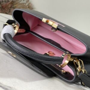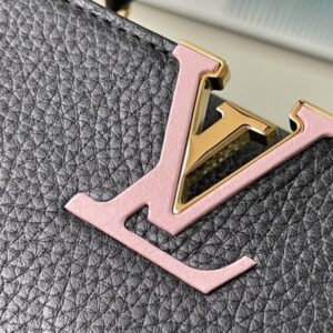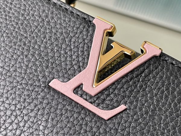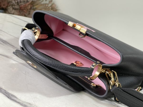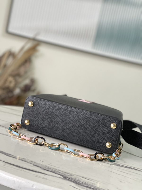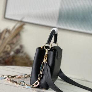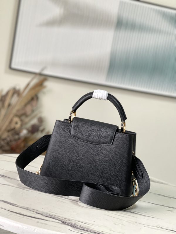 Black small This Capucines small handbag is made of Taurillon leather, the metal and resin links are interlocked with each other, and the top handle and detachable wide shoulder strap add a fun carrying method. The signature flap of the Capucines collection is folded in to reveal the logo.