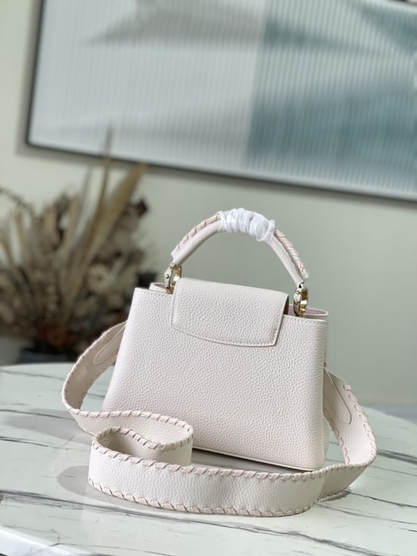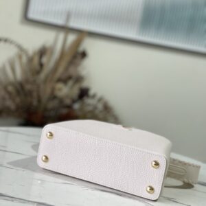Creamy white with light pink webbing style This Capucines BB handbag focuses on exquisite craftsmanship Taurillon leather bag body and handle and shoulder strap color details reflect contrast Metal texture leather wrapped V letter Capucines series flap can be external or adduction.