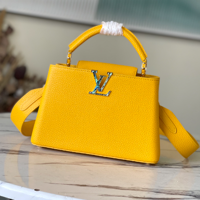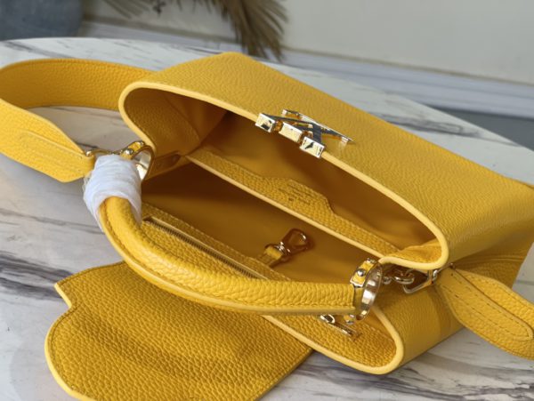 Yellow mother-of-pearl This Capucines small handbag is made of full-grain Taurillon leather, which makes the jewel-like logo shine like malachite, injecting grace into the classic design. The wide leather shoulder strap is suitable for shoulder or cross-body, and it is smart to shuttle between day and night.