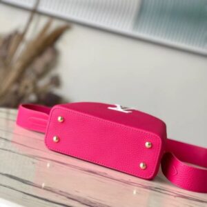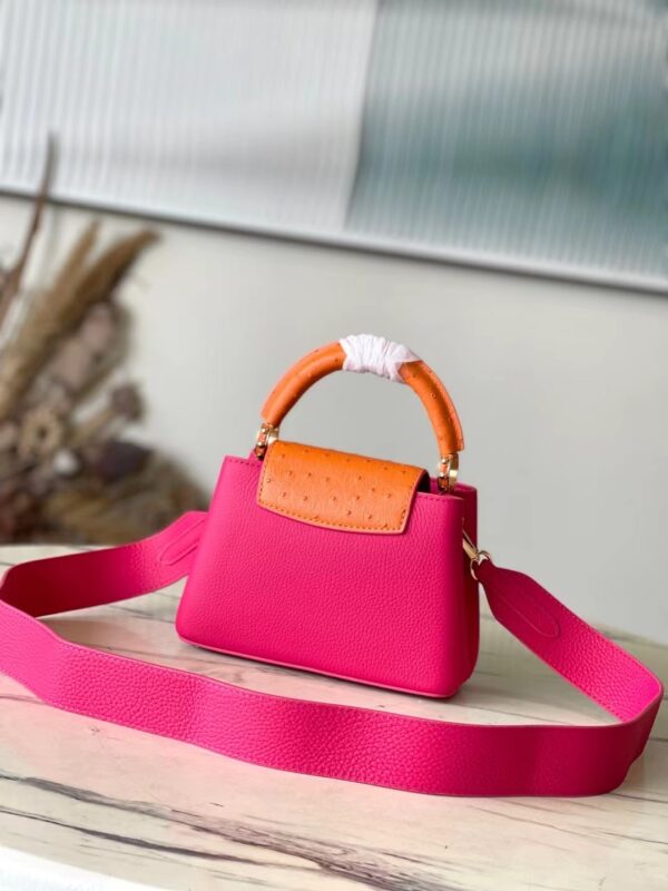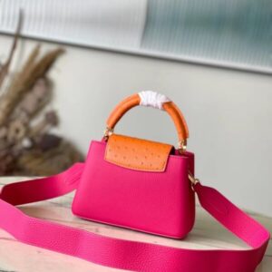 This Capucines handbag is made of Taurillon leather to create a delicate structure. The flap, handle and LV letter flap are wrapped with ostrich leather. The flap can be placed outside or inside to read the LV logo. The removable wide leather shoulder strap is full of modern fashion.