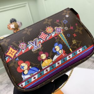 Christmas Pochette Accessoires mini clutch bag is made of Monogram or Damier Ebene canvas, depicting the cheerful scene of Louis Vuitton mascot Vivienne playing in the playground, incorporating brand iconic elements. The chain can be attached to a belt or bag.