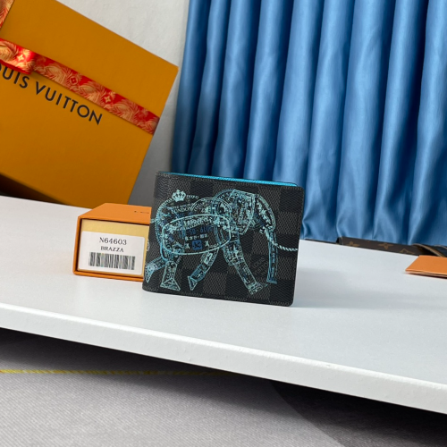This Slender wallet showcases the exotic style of the Louis Vuitton stamp theme. The image of a running elephant is composed of Damier Graphite canvas against the passport stamp pattern, continuing Louis Vuitton’s travel heritage and is an ideal gift for travel lovers.