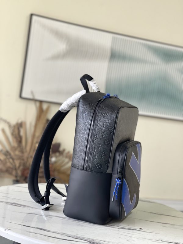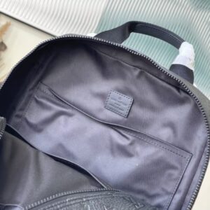 This Dean backpack is stitched with plain calfskin and Monogram embossed Taurillon leather, rendering eye-catching color blocks for the elegant box-shaped design. Zig-zag stitching outlines an oversized logo, and a zip front pocket provides easy access to essentials.