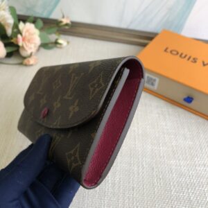 Purple red Doudou wallet exclusive real shot! Functional and richly designed, the Emilie Wallet is crafted in supple Monogram canvas with a vibrantly colored interior for ultimate elegance. The multi-pocket design and striking shape lend it irresistible allure.