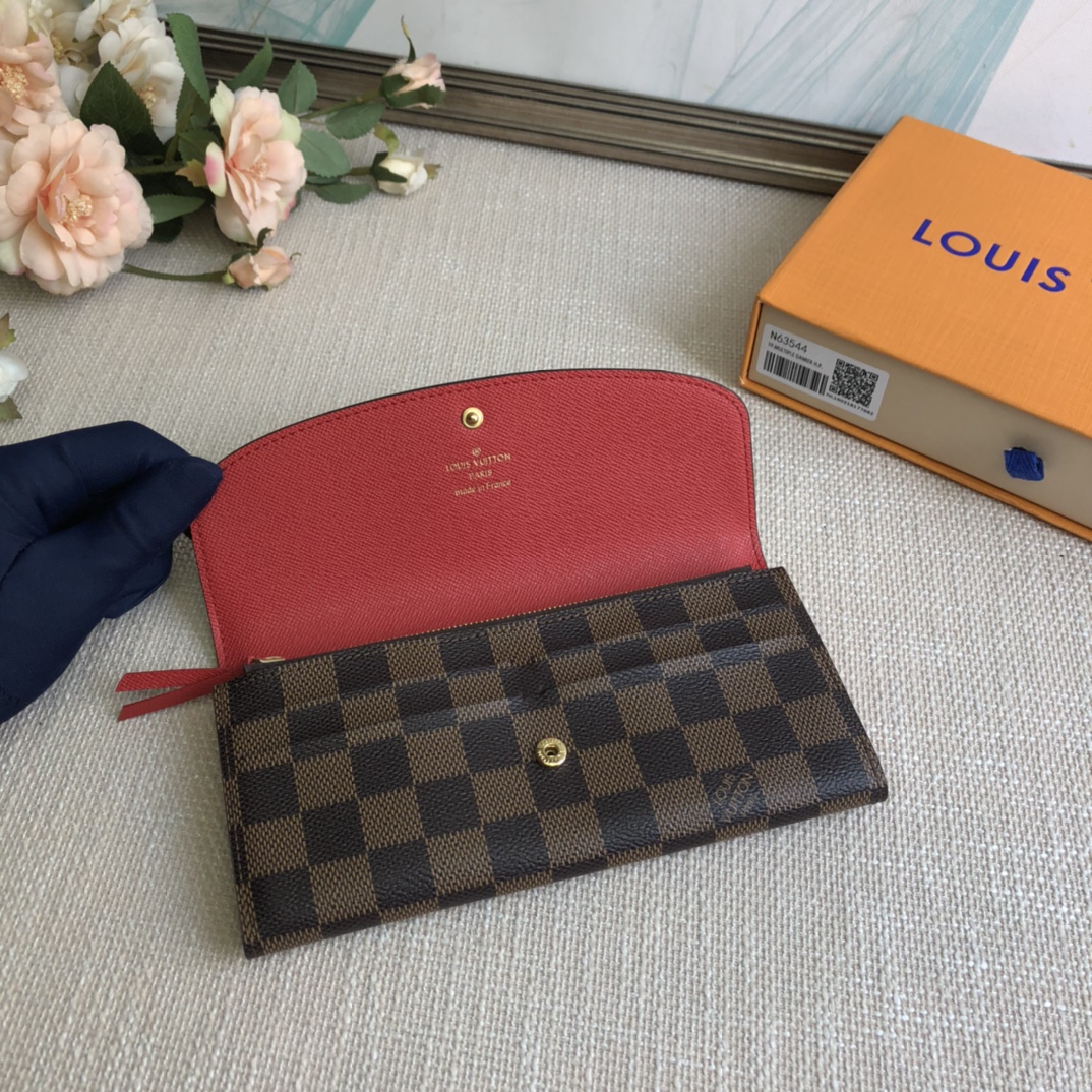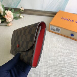 Coffee grid red bean wallet exclusive real shot! Functional and richly designed, the Emilie Wallet is crafted in supple Monogram canvas with a vibrantly colored interior for ultimate elegance. The multi-pocket design and striking shape lend it irresistible allure.