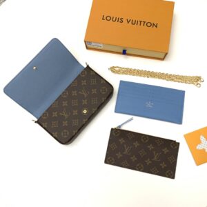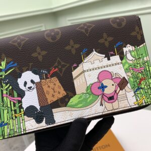 This Félicie Pochette handbag is made of Monogram canvas and fabric lining, depicting the scene of the brand mascot Vivienne taking a selfie on the Great Wall, with the giant panda next to him. An optional chain and detachable pocket allow for flexibility.