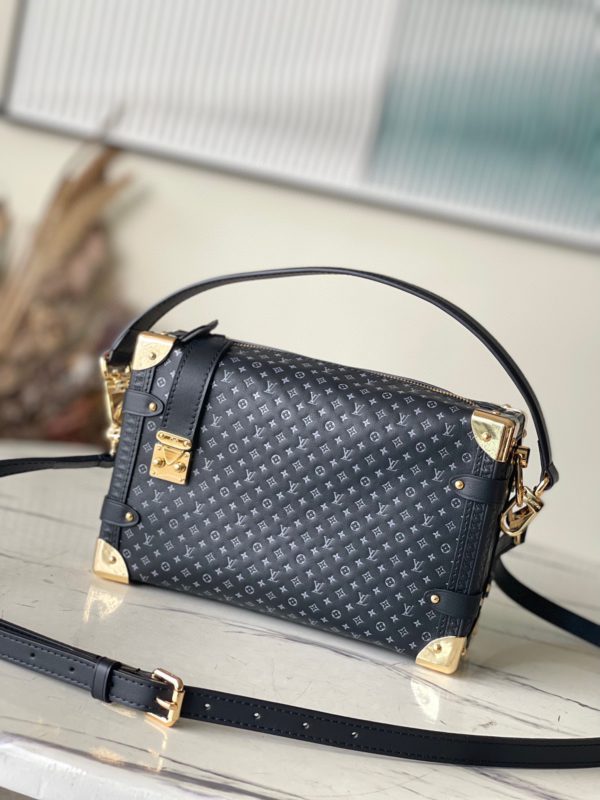 Black full leather bag inspired by suitcase. The overall use is the classic monogram, the bag is surrounded by metal edge design, retains the signature hard box technology, perfectly blends leather and metal, soft and hard, not only shows the softness of the leather but also incorporates a bit of laziness and casualness .