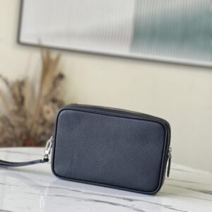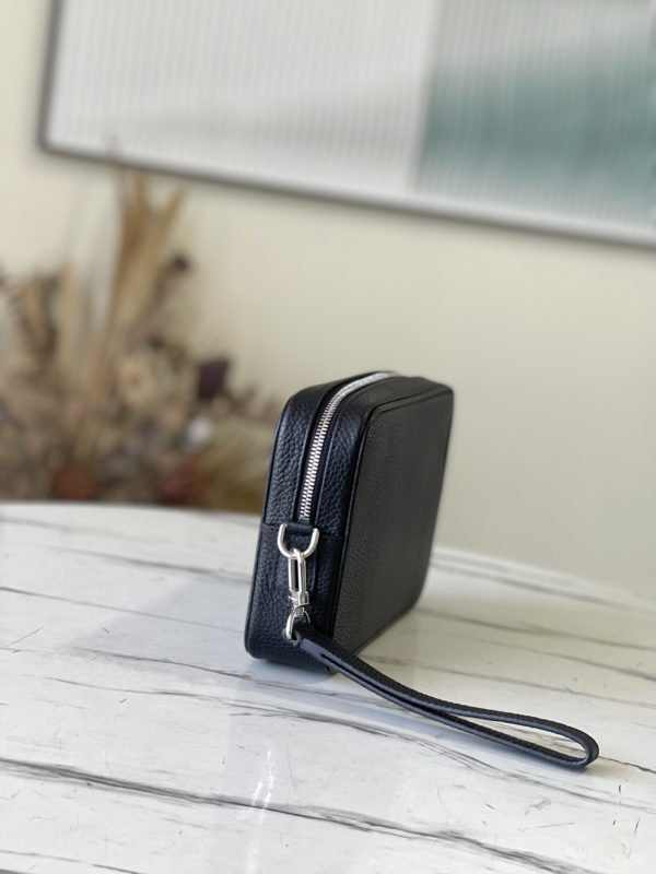 Black Lychee Pattern This Kasai clutch is crafted from black full-grain Taurillon leather with an elegant style. Equipped with cowhide trim, silver-tone metal hardware and a leather strap, it can be clipped to the elbow or tied around the wrist. Featuring multiple pockets and 10 credit card slots, this compact zipped clutch has enough room for all men’s everyday essentials.