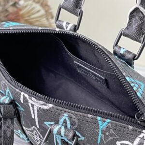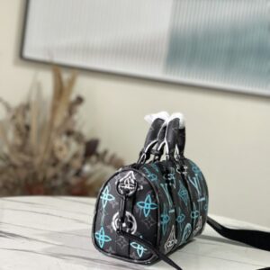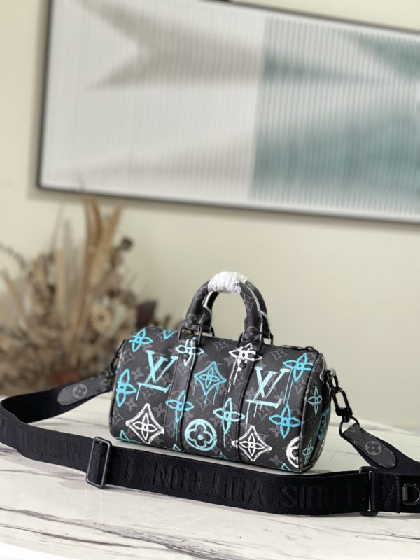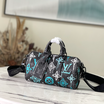 This Keepall Bandoulière 25 handbag is made of Monogram Eclipse canvas, with a spray-painted Monogram pattern full of street art atmosphere. A compact design for urban mobility, the side straps and leather nameplate continue the signature elements of the Keepall duffle bag.