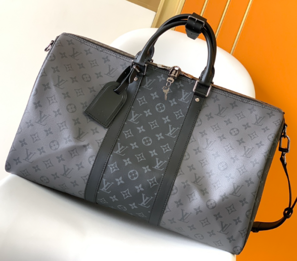 This Keepall Bandoulière 50 travel bag uses light-colored Monogram Eclipse Reverse canvas instead of dark-colored Monogram Eclipse canvas to create a heroic and bold temperament. This classic soft travel bag features a leather top handle and two straps on the side, all in black to make it recognizable. Carry-on luggage size, plenty of interior space.