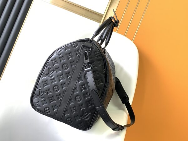 Keepall BANDOULIÈRE 50 travel bag is Monogram Shadow leather with full-width Monogram embossing and matte metal parts to achieve a minimalist design. The cabin luggage size is suitable for short trips. Born in the 1930s, the Keepall line of soft travel bags is as classic as it is today.