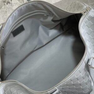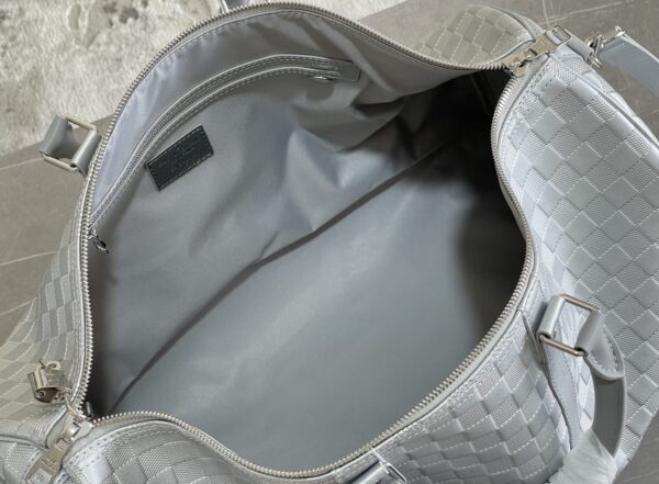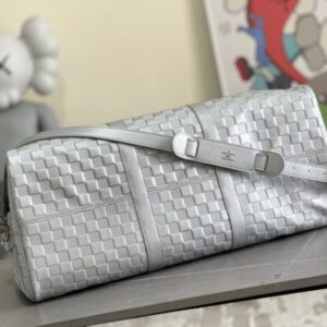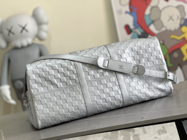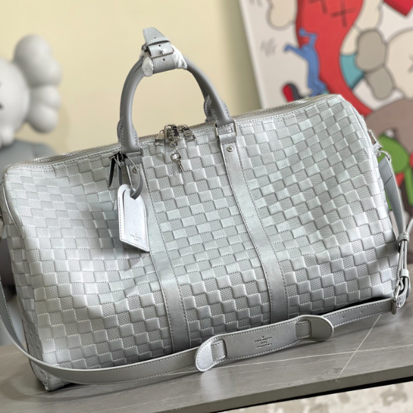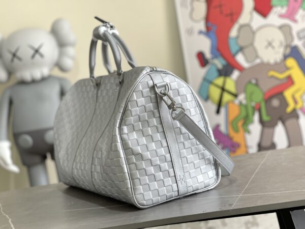 KEEPALL BANDOULIèRE 50 travel bag Virgil Abloh looks back at the urban nightlife of the 1990s, giving the Glitter capsule series Keepall Bandoulière 50 travel bag a shiny luster, revealing the dazzling style of a disco ball. Full leather embossed silver travel bag oo[handshake][handshake] calf leather presents the classic Damier checkerboard pattern, with non-grain leather trim.