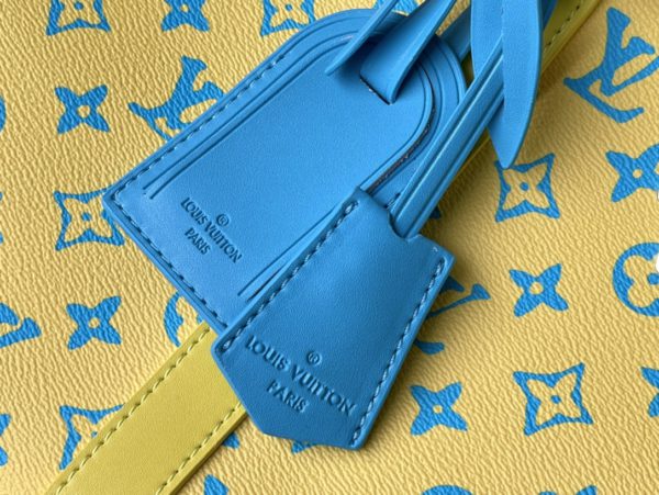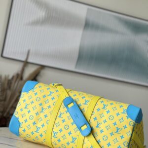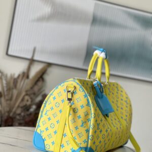 This Keepall Bandouliore50 travel bag is made of Monogram Playground canvas, with vivid colors depicting the Monogram pattern like a clay sculpture. The reinforced corners, nameplate, and key case are all made of leather, which complements the colors of Monogram flowers and letters.