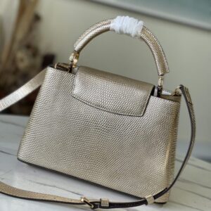 Golden Lizard small Capucines handbag delicately blends graceful lizard skin outer layer, delicate sheepskin inner lining and shiny metal parts, the iconic flip achieves two styles of fashion: the inner one for reading the logo, the outer one for blooming Monogram flowers, Brighten up an eye-catching corner for evening occasions.