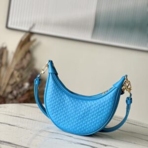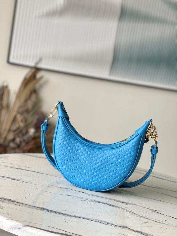 Blue Loop bag in calf leather with Monogram pattern in miniature. The colorful silk-screened lettering and Monogram floral pattern gently contrast with the body of the bag. The chain and signature Circle zip pull have a bright finish.