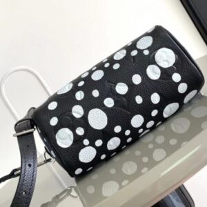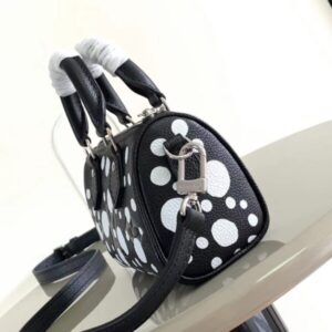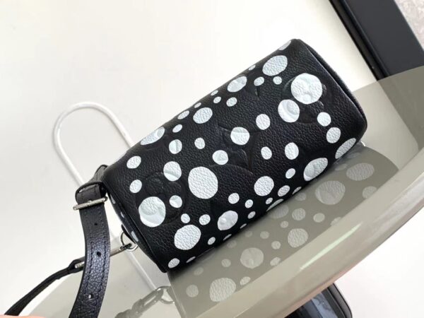 This LV x YK Nano Speedy handbag chooses to illustrate the theme of infinite polka dots in the Louis Vuitton x Yayoi Kusama collaboration series. The famous Japanese artist used the polka dot pattern to symbolize the eternity of time, embellished with Monogram embossed calfskin, paying tribute to the elegance and craftsmanship of the Speedy handbag in a pocket version.
