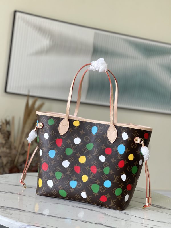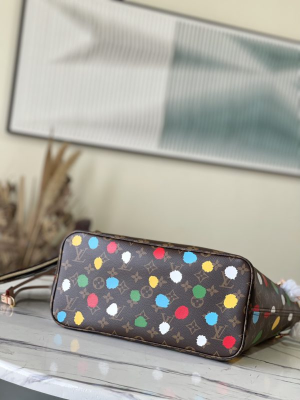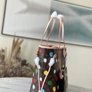 This LV x YK Neverfull medium-sized handbag selection x Yayoi Kusama cooperation series hand-painted effect polka-dot printing, reproducing the visual business card of this famous Japanese artist on Monogram canvas. The complex silk screen printing process creates a three-dimensional texture, which makes the functional design burst with vitality.