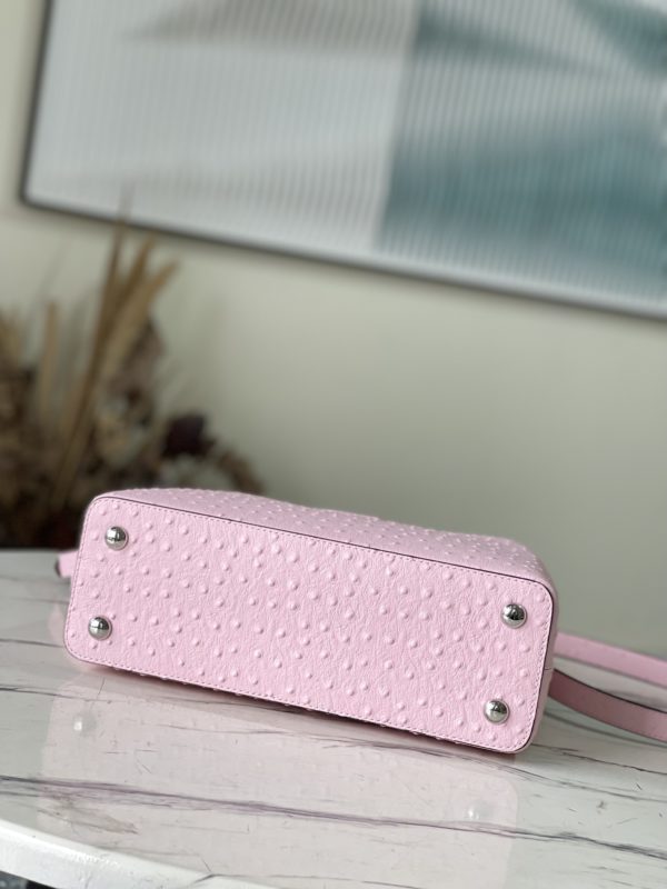 Light pink medium-sized Capucines ostrich leather handbag, moderate hardness handle, gorgeous buckle connecting the handle, spacious and practical shape, etc. The drop cover can be used in two ways, and it can be placed outside the bag to show the fashion trend of the Monogram flower pattern.