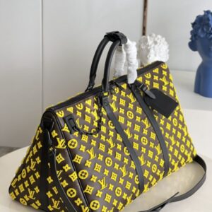 ellow Flocked Travel Bag Series Louis Vuitton Men’s Artistic Director Virgil Abloh interprets classic travel bags with interesting geometric shapes, creating a yellow Monogram Tuffetage canvas version of the Keepall Triangle BANDOULIÈRE 50 travel bag. The triangular shape is complemented by a pair of smooth leather top handles and side straps that complement the yellow Monogram embroidered background. This travel bag holds a variety of travel essentials.