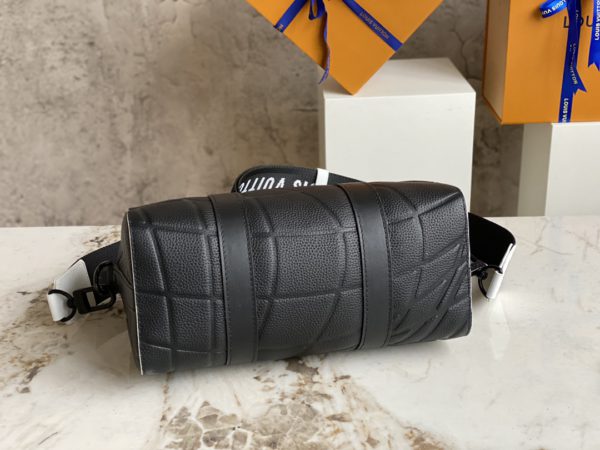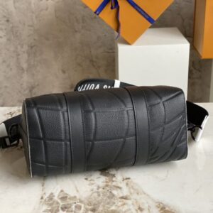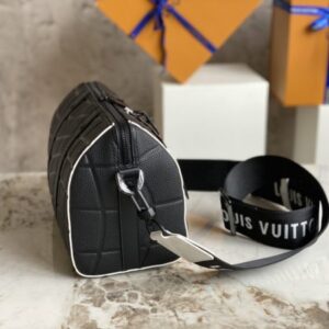 Black men’s bag pillow bag series CITY KEEPALL handbag m21543 gram color (letter) This City Keepall bag is made of Taurillon leather and is part of the 2022 FIFA World Cup capsule collection. The embossed pattern on the leather is reminiscent of the net used for goals. The bag is signed with the initials of LV in the same color, and it also has a leather nameplate shaped like a football team’s crest.