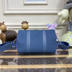 Menswear Artistic Director Virgil Abloh reimagines a classic bag – creating the Men’s City Keepall. Made of black grained leather with details in black and white Damier Distorted canvas. Decorated with initials.