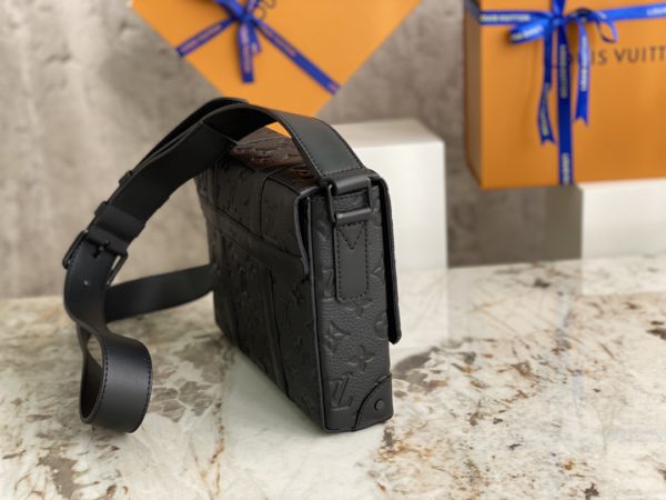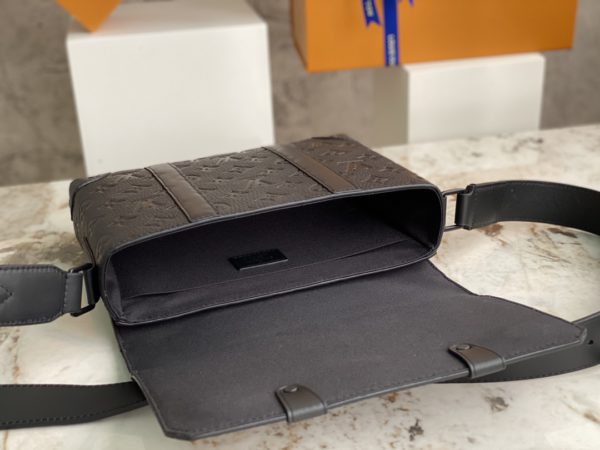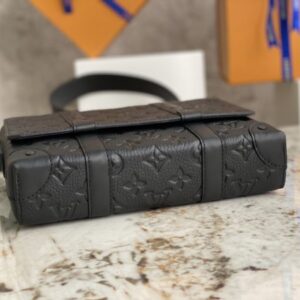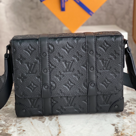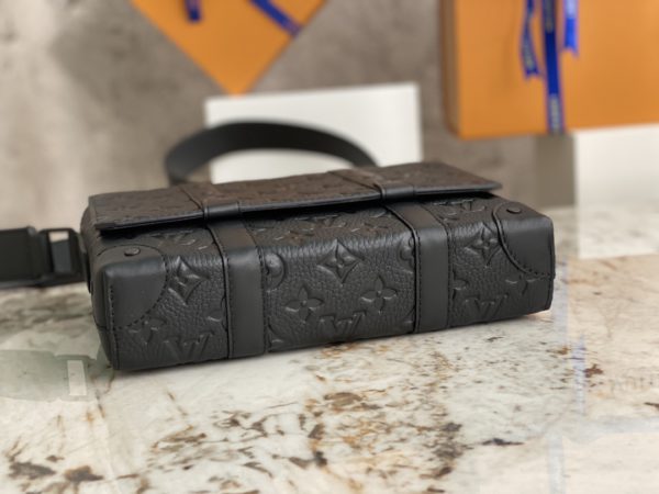 Black full leather men’s messenger bag series This small cuboid Trunk messenger bag is made of Monogram embossed Taurillon leather, continuing the brand’s classic hard case elements such as rivets and reinforced leather corners. Detachable, adjustable strap for comfortable carrying.