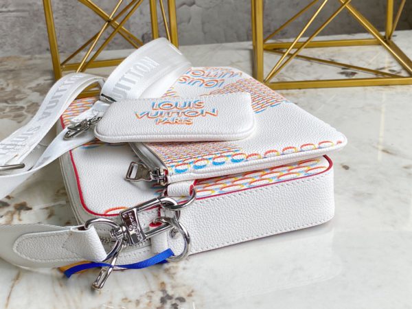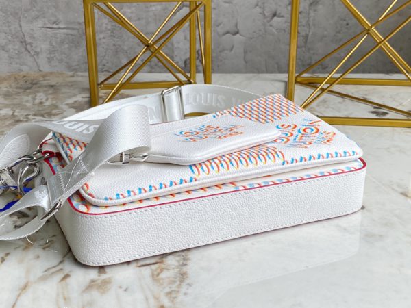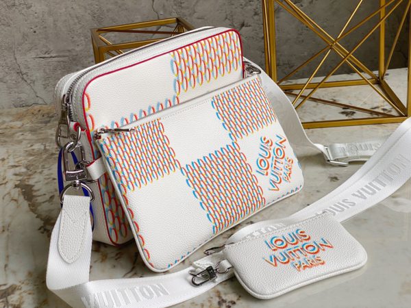 Men’s three-piece white grid full leather suit series 2022 The new Trio messenger bag releases the trendy charm of Damier Spray elements. Louis Vuitton’s iconic Damier motif is dramatically magnified and reflected in 3D, while smooth and grained calfskin create multiple structures, including a detachable front pocket and coin purse on the shoulder strap, creating streetwear for Damier lovers.