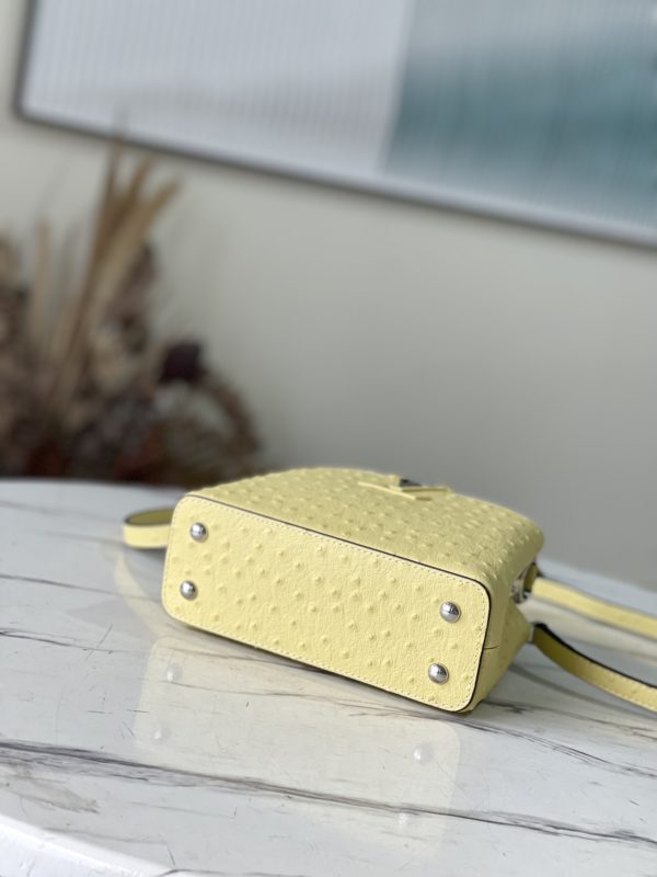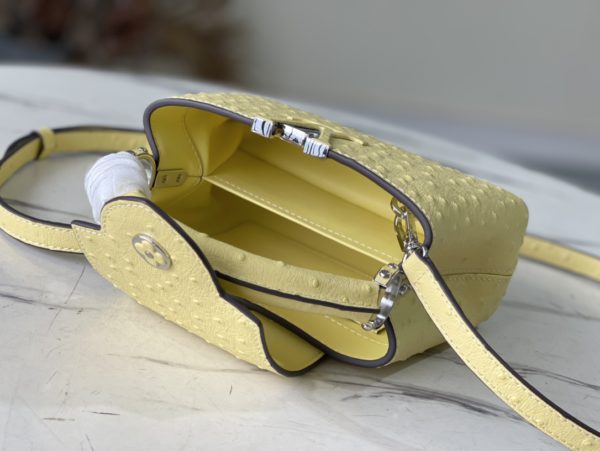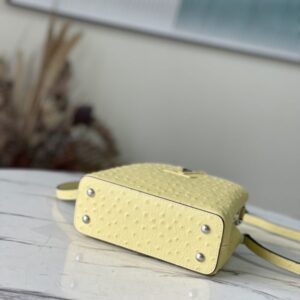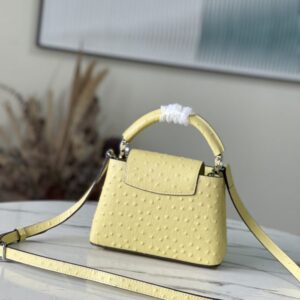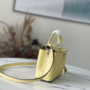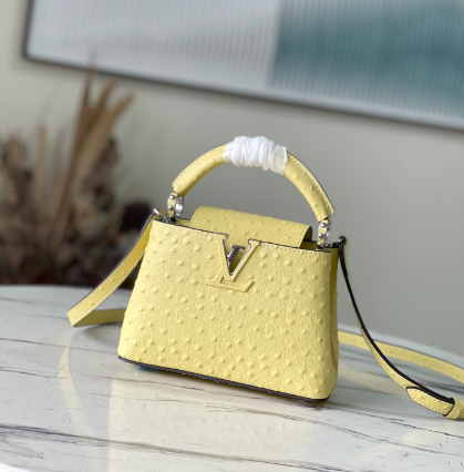 Yellow ostrich leather mini Capucines ostrich leather handbag, moderate hardness handle, gorgeous buckle connecting the handle, spacious and practical shape, etc. The drop cover can be used in two ways, and it can be placed outside the bag to show the fashion trend of the Monogram flower pattern.