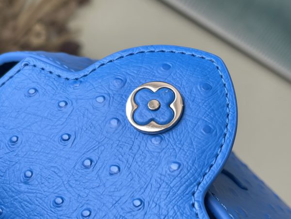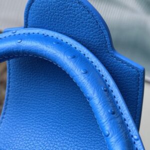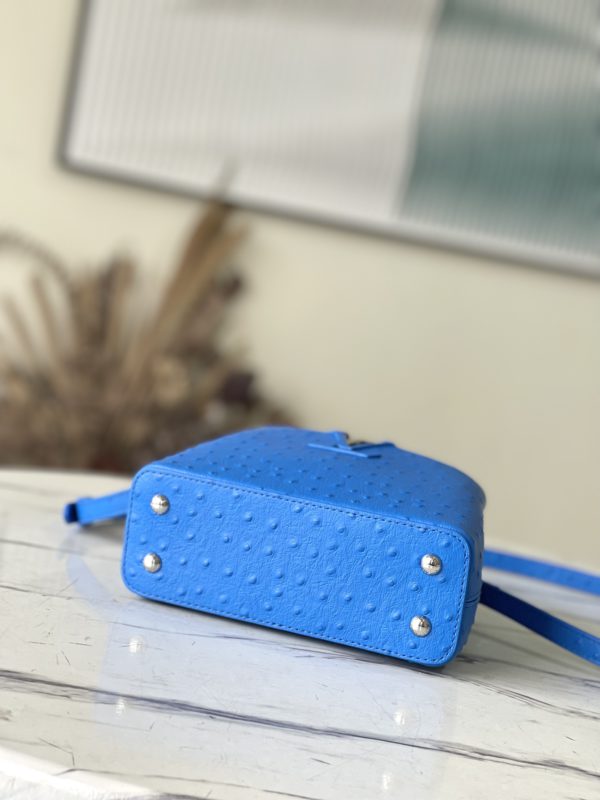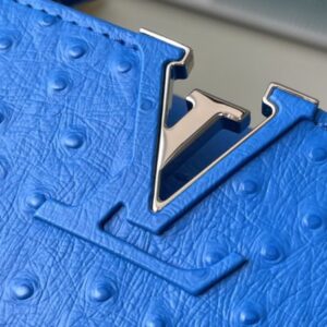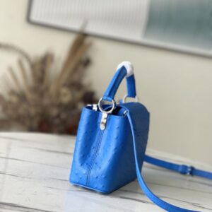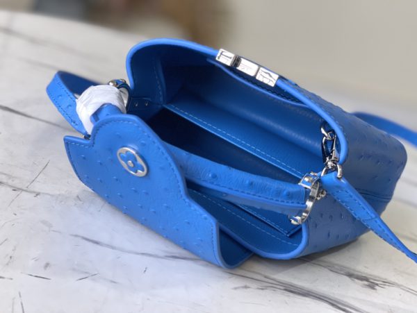 Blue ostrich leather mini Capucines ostrich leather handbag, moderate hardness handle, gorgeous buckle connecting the handle, and spacious and practical shape, etc. The drop cover can be used in two ways, and it can be placed outside the bag to show the fashion trend of the Monogram flower pattern.