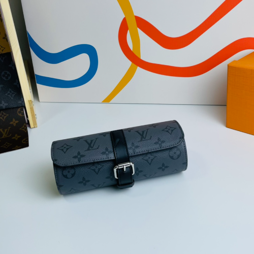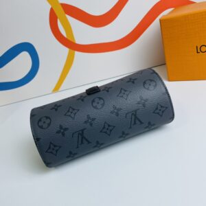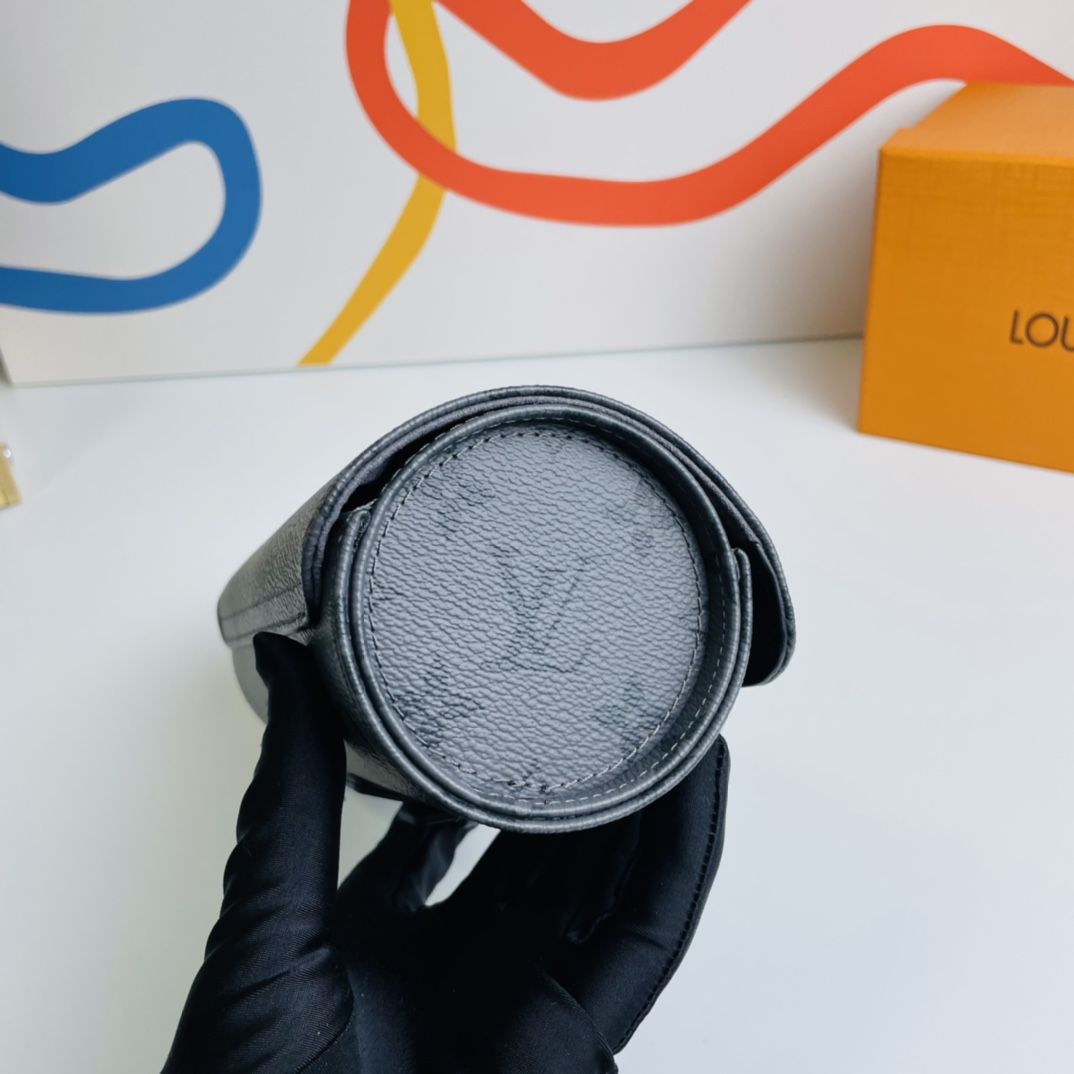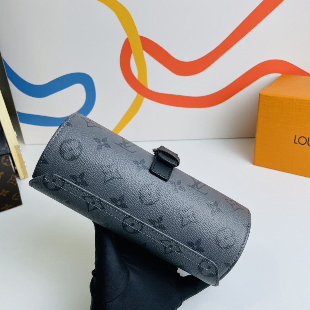 Exclusive real shot! This elegant watch case is crafted from sturdy Eclipse Monogram canvas and features a removable microfiber insert to securely store three watches. Leather strap and buckle design, safe and secure. Size: 20×8×8cm