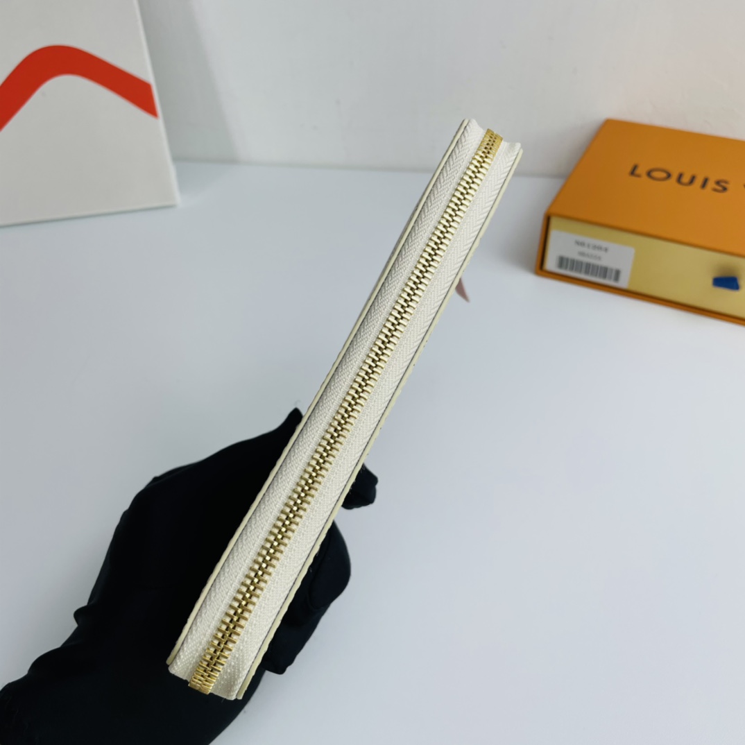 The Clemence wallet, small and compact yet roomy, is made of delicate and durable Monogram canvas. The bright-colored lining and leather zipper show the playful charm of women.
