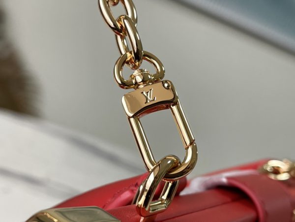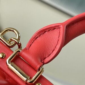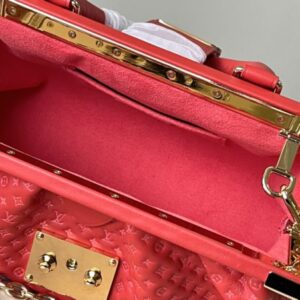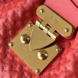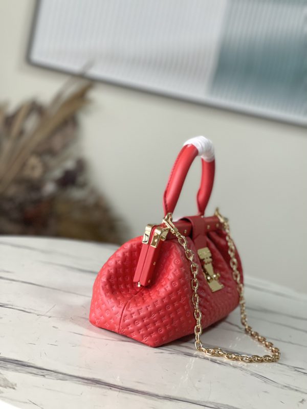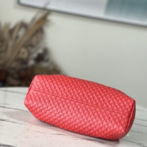 Carmine Monogram Clutch Bag from Nanogram Special Collection in soft calfskin, embossed with Monogram in odd proportions, with a slightly two-tone effect. The swivel handle joint folds inside the bag, transforming the bag into an elegant clutch.