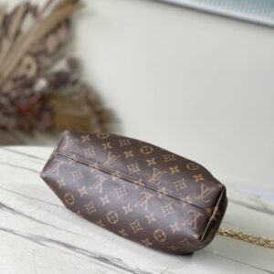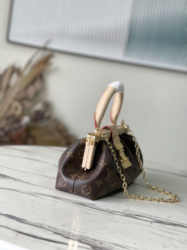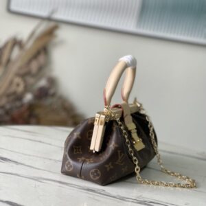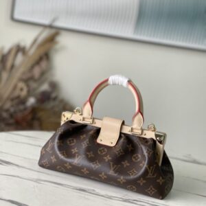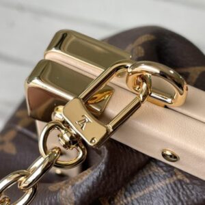 Monogram Clutch handbags are made of Monogram canvas with cow leather trim and classic S-lock locks, rivet buckles, metal corners, and other metal parts. It’s topped with a rolled leather top handle and features a detachable chain and retractable swivel joint.