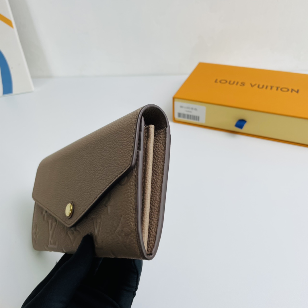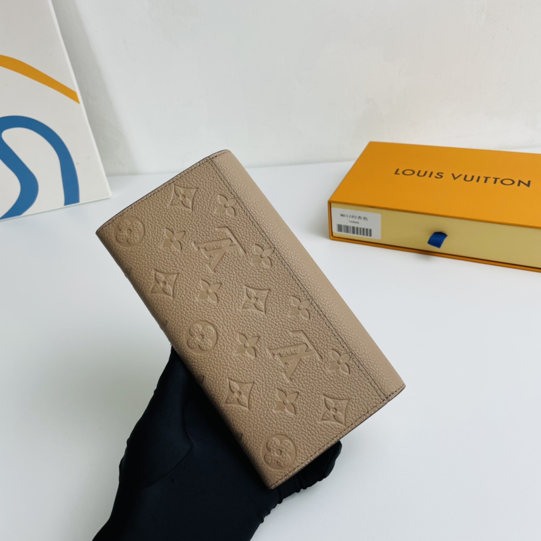 The envelope style Sarah Wallet features a meticulously embossed Monogram Empreinte leather exterior and a cleverly designed interior with numerous pockets and credit card slots.
