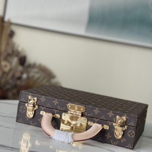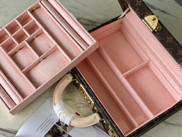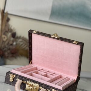 Pink This Monogram jewelry case is especially suitable for carrying precious items when traveling. There are thirteen compartments of different sizes, which are opened and closed by S lock and two suitcase mortise locks. This product is expected to arrive in more than three months.
