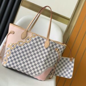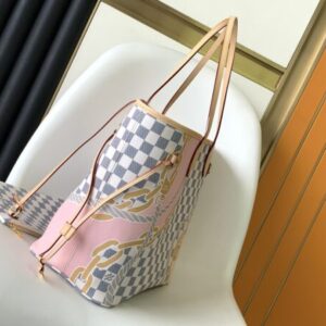 The Neverfull MM bag in Damier Azur coated canvas features a vibrant nautical print with rope and chain motifs, a fresh take on the classic checkerboard pattern. Tighten or loosen the side straps to switch between sleek and relaxed.