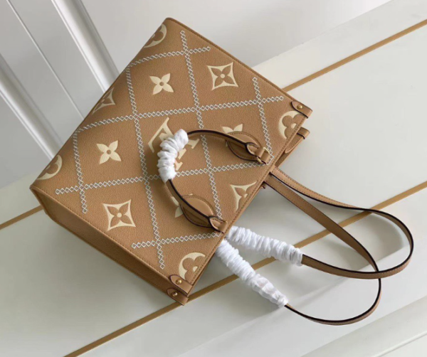 This Onthego medium handbag is made of Monogram Empreinte leather, which is printed, embossed and embroidered to present delicate stitching. The quilted interior resembles a traditional hard case. The focus design of the season has various carrying methods and sizes: 35 x 27 x 14 cm