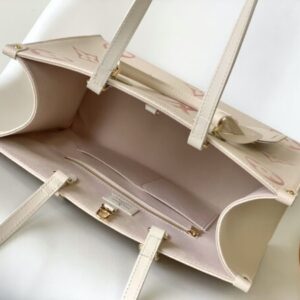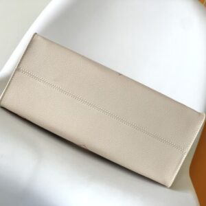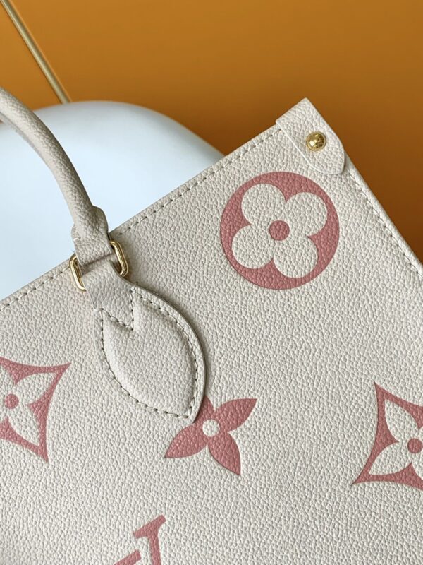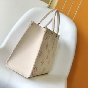 This OnTheGo medium-sized Tote bag prints the Medium Monogram pattern first and then embosses it on soft grained calfskin. Its ample interior can accommodate laptops and other office supplies. back.