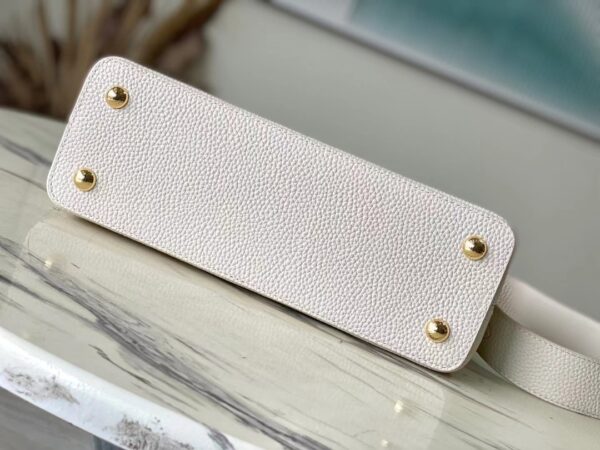 Ostrich pattern Capucines handbag is made of Taurillon leather to create a delicate configuration, and the flap, handles and LV letters are wrapped in ostrich leather. The flap can be opened or closed to read the LV logo, and the detachable wide leather shoulder strap is full of modern fashion.