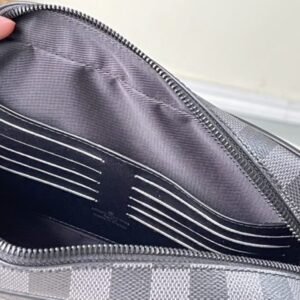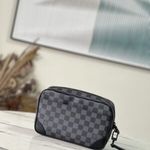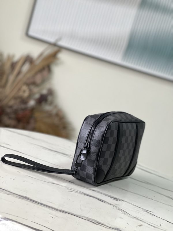 Black Grid Men’s Bag Clutch Clutch Collection POCHETTE KASAI Clutch This Kasaï pouch is made of Damier graphite canvas, with reinforced corners and black leather straps on the front, and a zip back pocket. Its wide zip opening provides access to three flat pockets and ten card slots. The piece can be worn as a bag or on the wrist with its detachable strap.