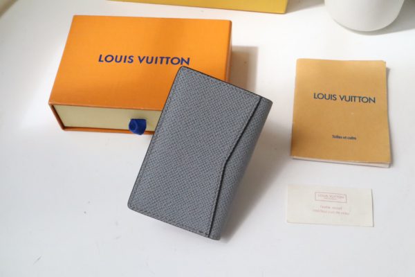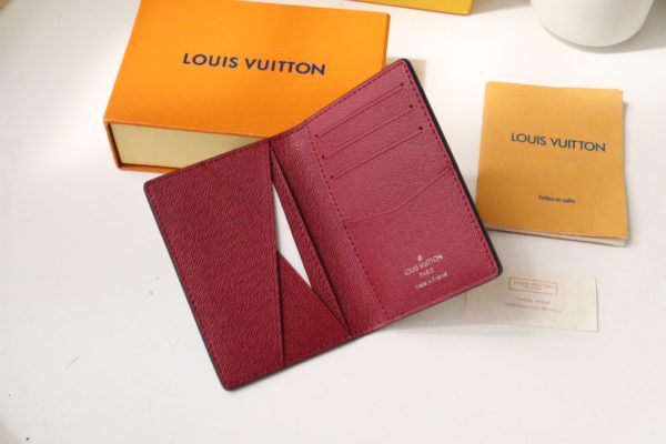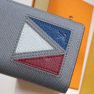 This pocket wallet features marquetry in which the V pattern is embedded in fine Taïga leather, echoing the traditional Louis Vuitton logo in vibrant colors. The slim shape hides plenty of room and slips easily into your pocket.