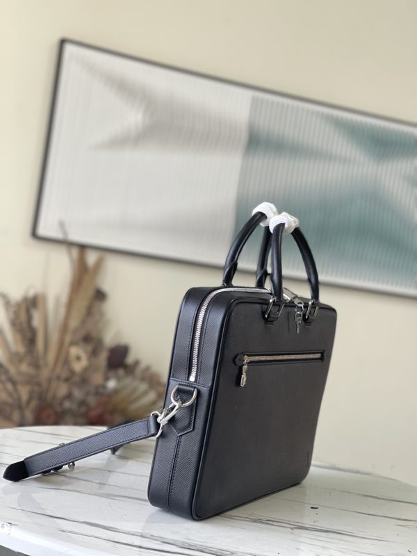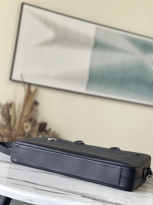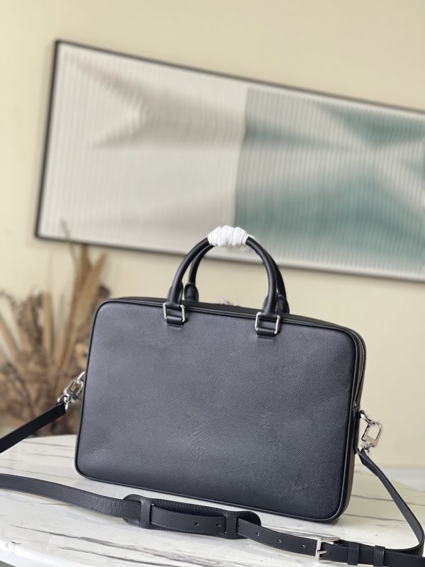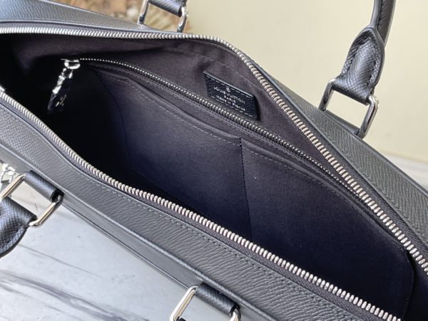 Sophisticated and functional, this Porte Documents briefcase in Taiga leather. A stylish briefcase with sophisticated leather trim and ample interior space for A4-sized documents, an iPad or laptop, and other essentials. The zipped exterior pocket provides quick access to essentials such as travel tickets, documents, keys and more.
