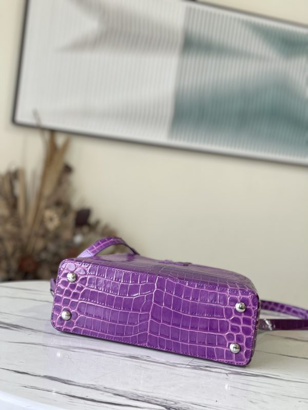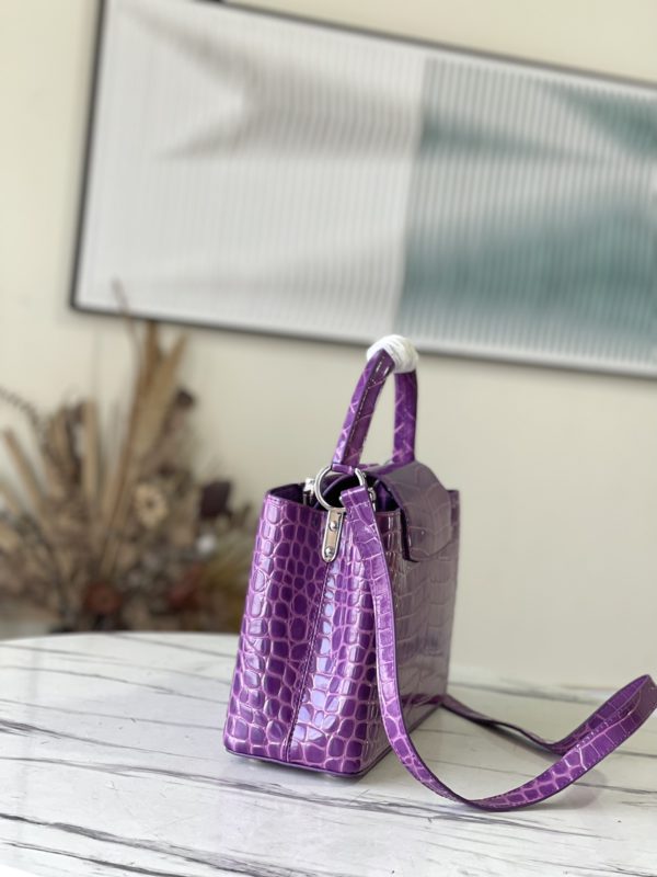 Purple crocodile pattern silver buckle This precious Capucines medium handbag is made of crocodile pattern and treated with high gloss. The income bag displays the letter logo and can be turned inside out to present the Monogram Flower pattern. The ideal accessory for night out.