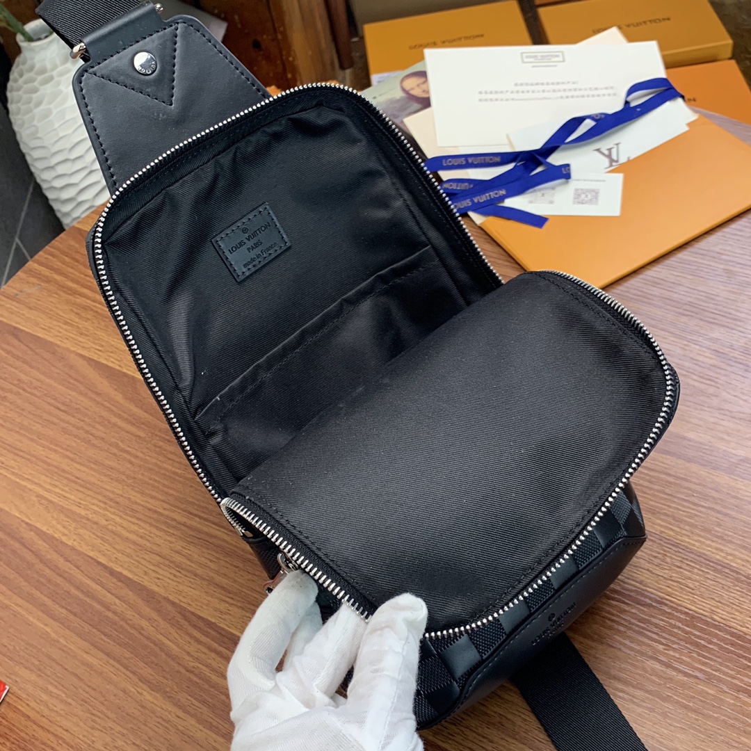 The Avenue Shoulder Bag is sporty and casual. Crafted in Damier Infini leather, the Avenue Shoulder Bag is the perfect bag for you on the town. Compact and lightweight, the bag’s shape fits the curves of the body. It’s the ideal small bag for the modern, active man.